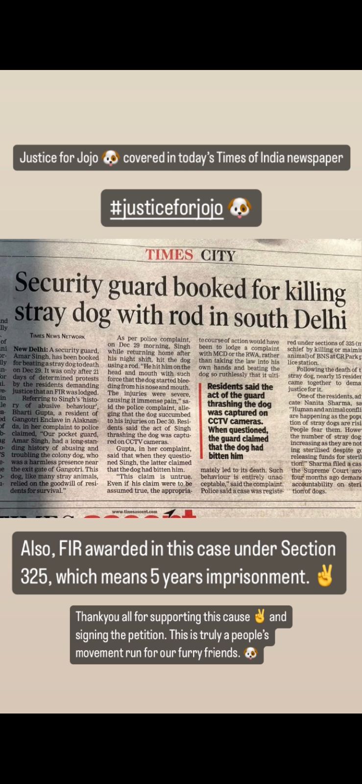FIR has been filed against the man thanks to a whole group of animal lovers. I went there personally and realised the local RWA and guards are animal haters. POSs were ok that he was beaten to death.