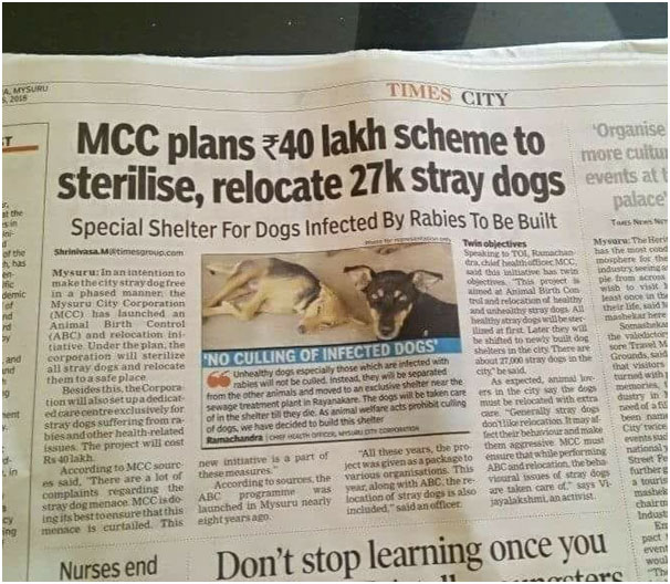We have learned through several newspaper reports (copies attached) that the Mysore municipal corporation is killing as well as dislocating stray dogs. This is in violation of :