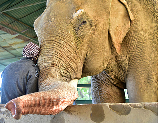 These are the moments from Mohan’s life we’d like to look back on and remember him by: Bewildered but relaxed in the ambulance by moonlight, surrounded by a smiling rescue team, on his way to a better place. His first steps into the rescue center, the entire team waiting for him — in fact, beaming up at him as he tentatively made his way into his new home. His first walk at the center, fascinated by the sensation of grass and mud under his feet, and his utter joy in being able to scratch himself on a tree or toss cool mud all over himself. When Mohan was introduced to our young bull elephant Wally while out on a walk, he seemed reserved, almost wary, at first. But Wally’s exuberance and excitement at meeting a new friend put Mohan at ease, and he walked beside the young elephant, occasionally linking trunks with him and rumbling at him. Mohan’s interaction with everyone around him, his pleasant surprise at the sensation of his curious outstretched trunk being met with reassuring hands and cajoling voices, left us all in awe of this massive bull elephant’s gentleness. For everything that human beings had done to him, Mohan was not vengeful. The bonds he developed with the staff were always defined by their calmness: Mohan listening patiently as his keeper talked to him while out on a walk, Mohan calm and cooperative as the veterinarians carried out the treatment routines that we hoped would heal the hurt humans had caused him thus far. He was a wonderful elephant to be around, his aura of gentle strength pervading anyone who had the absolute honor of being in his presence. We want to remember Mohan as he stood enjoying the drizzle of the rain on his body, and as he strolled carefree on his walks. We want to remember Mohan resting his large head against the small human frame of his keeper during quieter moments of introspection and bonding, alongside memories of him lying perfectly still in his pool with the cool calm water engulfing his massive frame. We want to remember moments where he was at peace with the world.